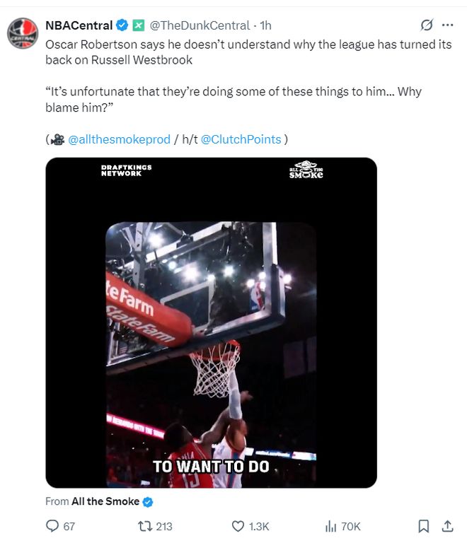 NBA名宿奧斯卡-羅伯特森在參與一檔節(jié)目時(shí)也力挺威少應(yīng)該繼續(xù)留在NBA打球,大O表示:不明白為什麼NBA沒有球隊(duì)想要簽下威少,很遺憾聯(lián)盟對(duì)他做出這樣的事,如此出色的他為何被冷遇,為何要用一些莫須有的問題來責(zé)怪他呢?