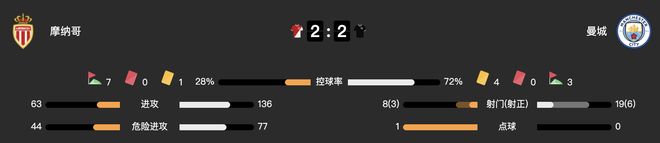 雷速體育10月2日訊 稍早前結(jié)束的歐冠聯(lián)賽階段第2輪比賽中,摩納哥主場2-2戰(zhàn)平曼城。兩隊本場數(shù)據(jù)如下射門:8-19射正:3-6控球率:28%-72%