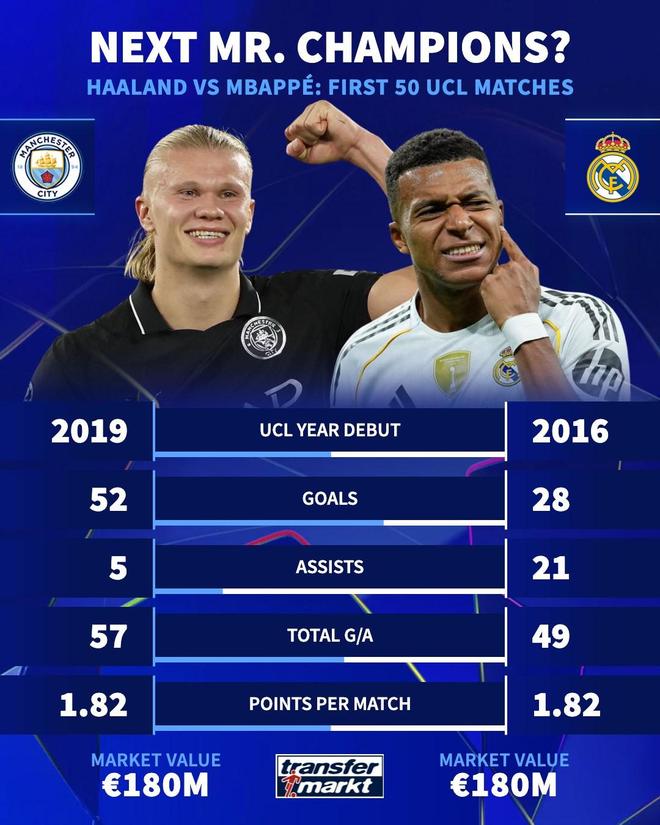 哈蘭德與姆巴佩前50場歐冠數(shù)據(jù)對比:進(jìn)球52-28,助攻5-21