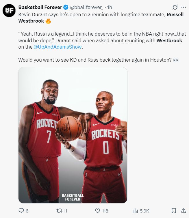 KD表態(tài)願(yuàn)與威少重聚:但我做不瞭主!答案大O力挺37歲神龜留在NBA