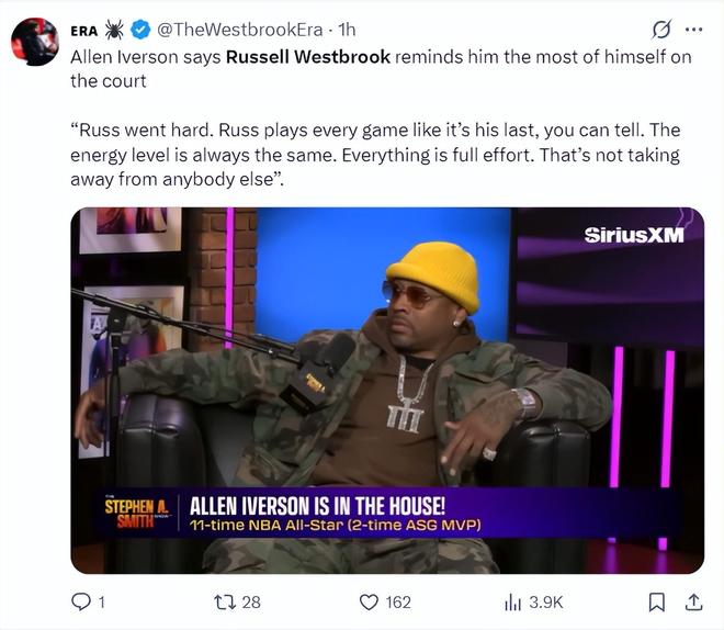 前NBA球星阿倫-艾弗森在一檔節(jié)目中力挺威少:看到威少在場(chǎng)上就像看到自己,每一場(chǎng)比賽都拼盡全力,他的競(jìng)技狀態(tài)始終如一,全力以赴貫徹到底 ,我並沒有感覺他影響到瞭其他人。