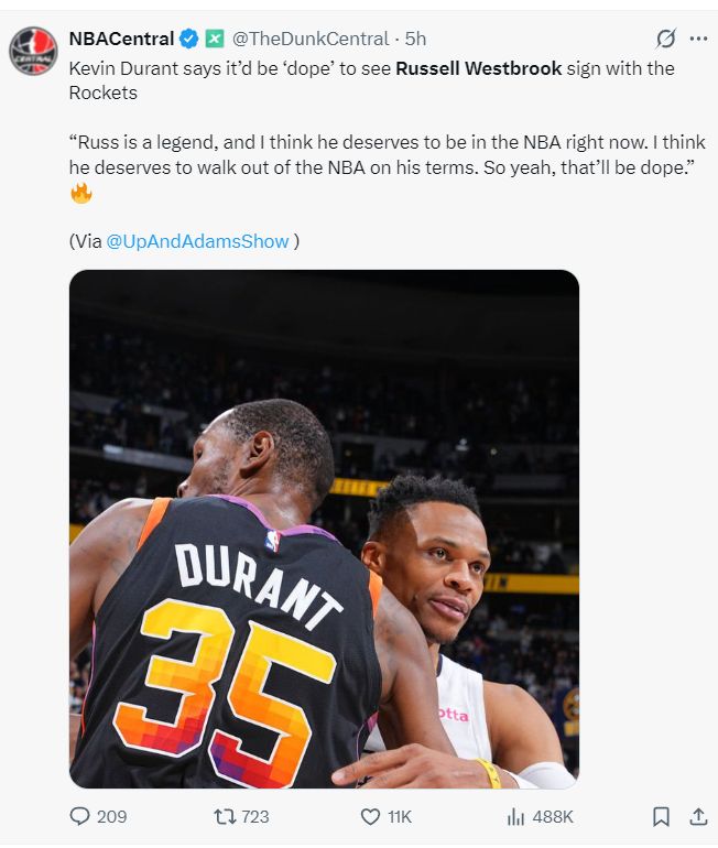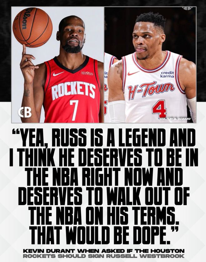 北京時(shí)間10月9日,火箭球星凱文-杜蘭特在接受UpAndAdamsShow訪問時(shí)談到瞭關(guān)於拉塞爾-威斯佈魯克與火箭的流言情況,KD表態(tài)願(yuàn)意跟威少重聚。