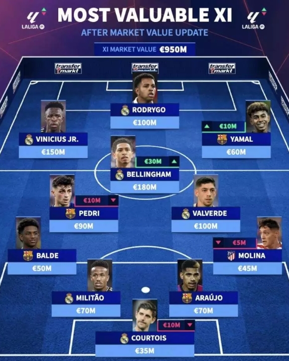 近期,西甲球員身價更新,一份最新的11人陣容榜單也應(yīng)運而生。這支陣容以億萬先生為主,其中不乏皇馬的4位明星球員,他們的身價令人瞠目