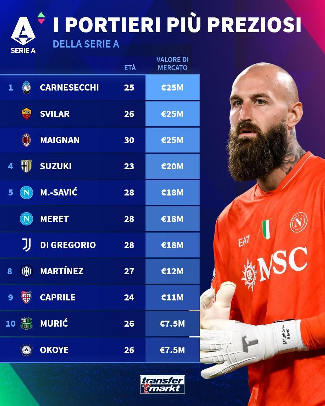北京時(shí)間10月9日,在更新了意甲球員的身價(jià)之后,德轉(zhuǎn)還列出了此次更新后意甲身價(jià)排名前10的門將,亞特蘭大的卡爾內(nèi)塞基、羅馬的斯維拉爾以及AC米蘭的邁尼昂同以2500萬歐元并列第二,帕爾馬的日本國門鈴木彩艷2000萬歐元排名第四。