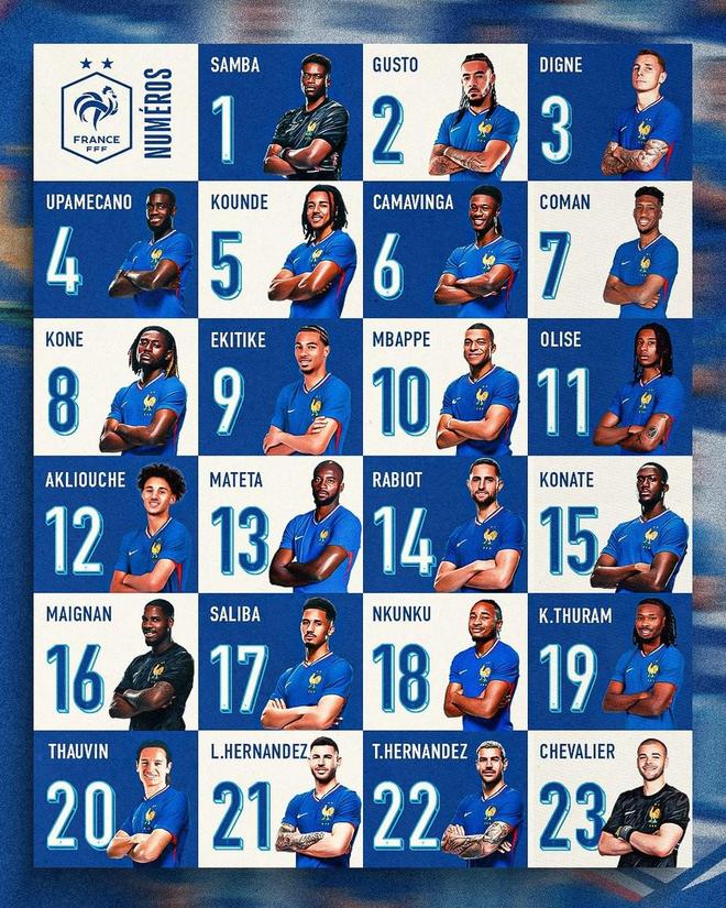 前鋒:12-阿克利烏什(摩納哥)、7-金斯利-科曼(利雅得勝利)、9-?;倏?利物浦)、13-馬特塔(水晶宮)、10-姆巴佩(皇傢馬德裡)、18-恩昆庫(米蘭)、20-托萬(朗斯)
