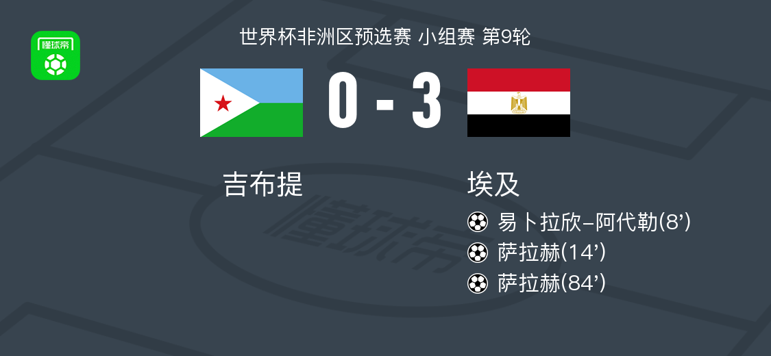 北京時(shí)間10月9日,世界杯非洲區(qū)預(yù)選賽小組賽第9輪,吉布提迎戰(zhàn)埃及。比賽開局階段,齊佐送出助攻,易卜拉欣-阿代勒冷靜破門,為埃及取得領(lǐng)先。隨后,馬哈茂德-特雷澤蓋精準(zhǔn)傳球,薩拉赫接球后再度攻破對(duì)手球門,將比分?jǐn)U大。進(jìn)入下半場(chǎng)尾段,馬爾萬-阿特亞送出關(guān)鍵助攻,薩拉赫完成梅開二度,鎖定勝局。最終全場(chǎng)比賽結(jié)束,吉布提 0-3 埃及。