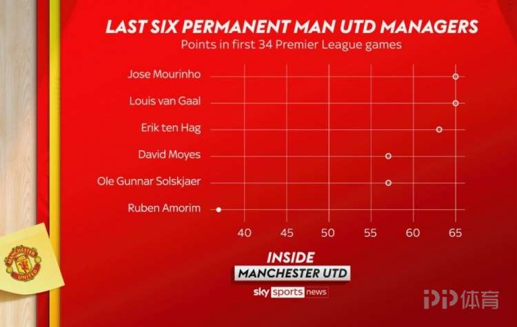 執(zhí)教曼聯(lián)的前34場英超比賽,索爾斯克亞和莫耶斯均拿到了57分,滕哈赫拿到了63分,而范加爾和穆里尼奧均拿到了65分。